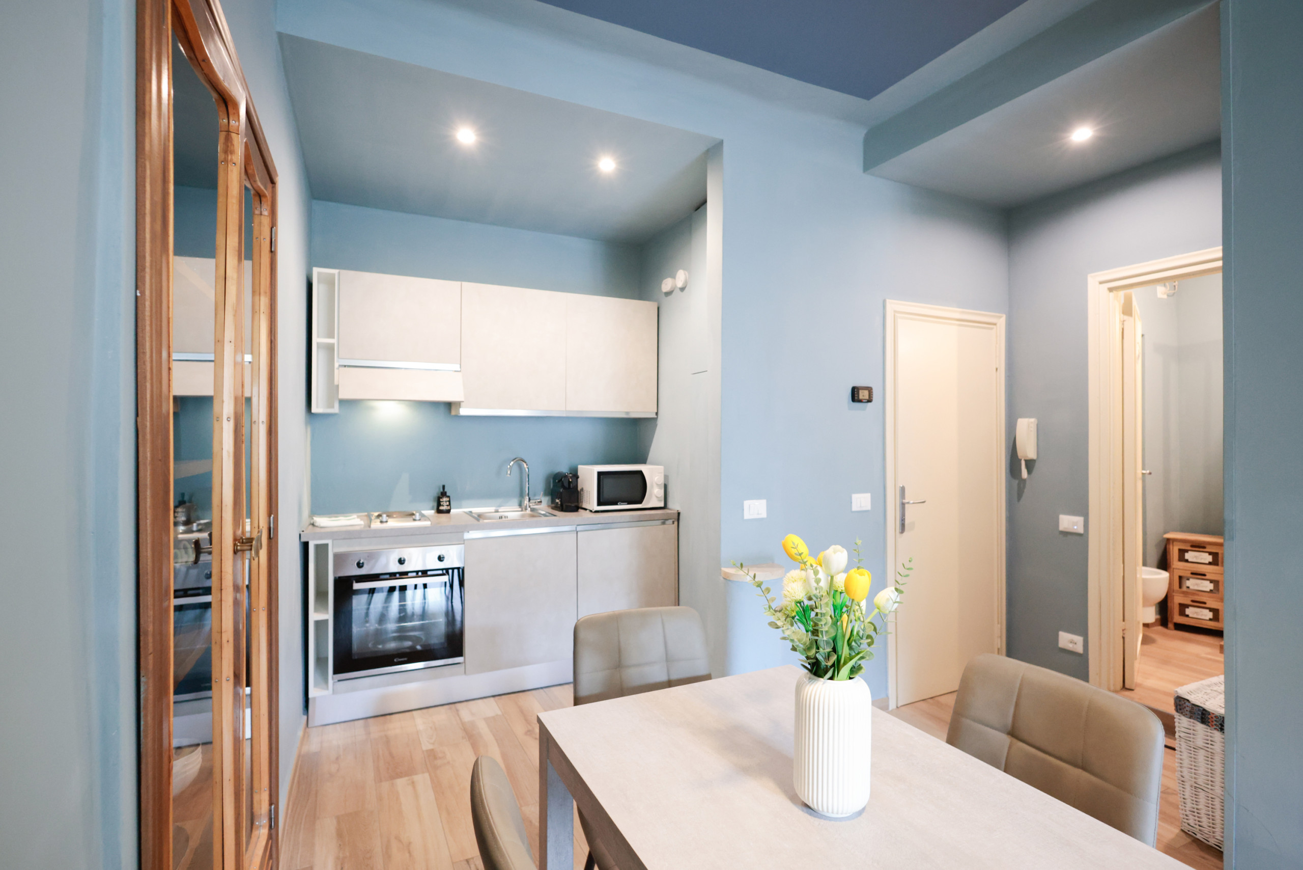 La cocina americana está completamente equipada con electrodomésticos de calidad, incluyendo refrigerador, cafetera, horno, microondas, vajilla, tostadora y hervidor. Ideal para preparar comidas rápidas o deliciosos desayunos antes de explorar la hermosa ciudad de Lucca.